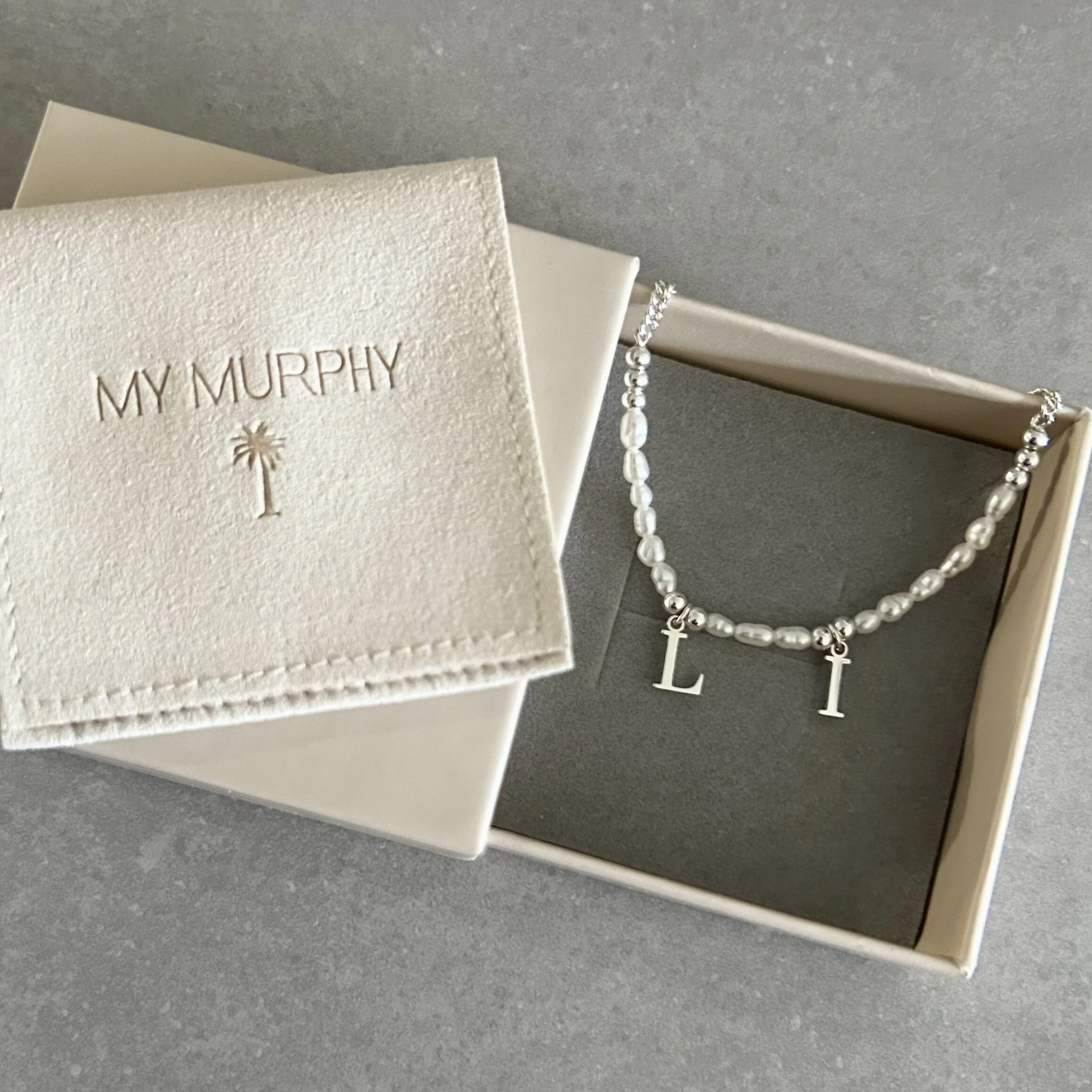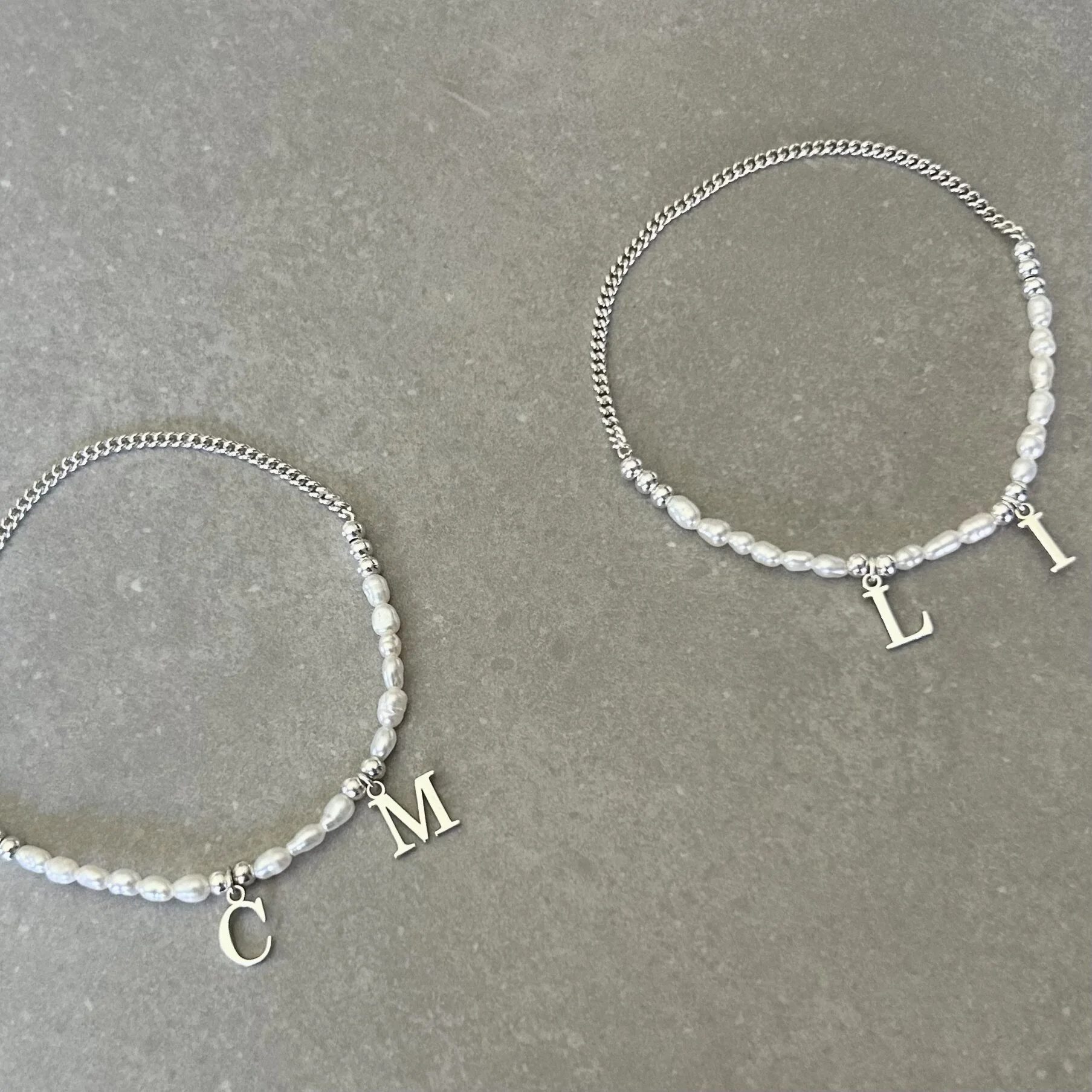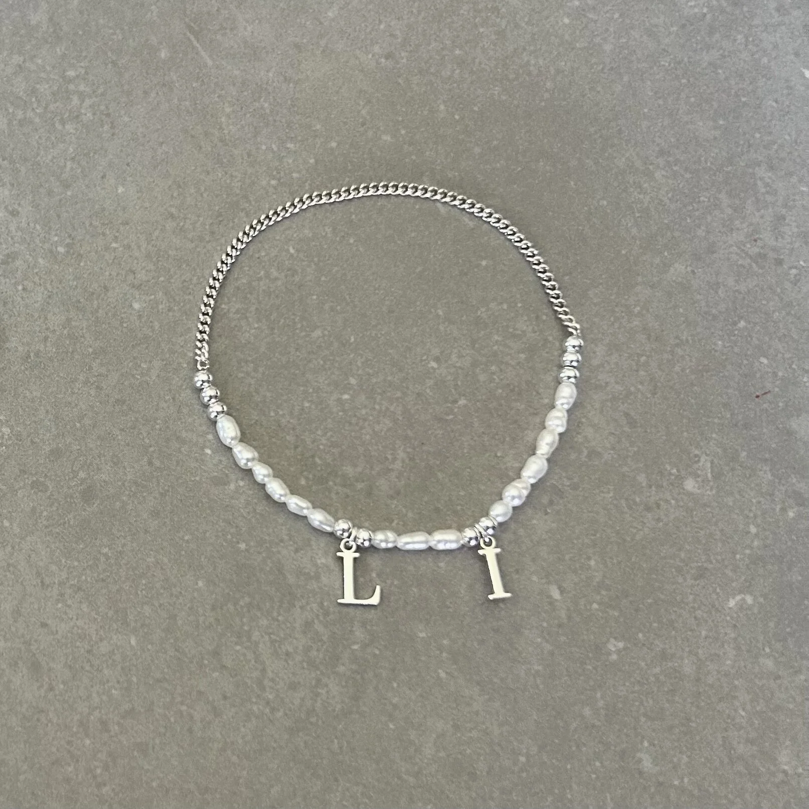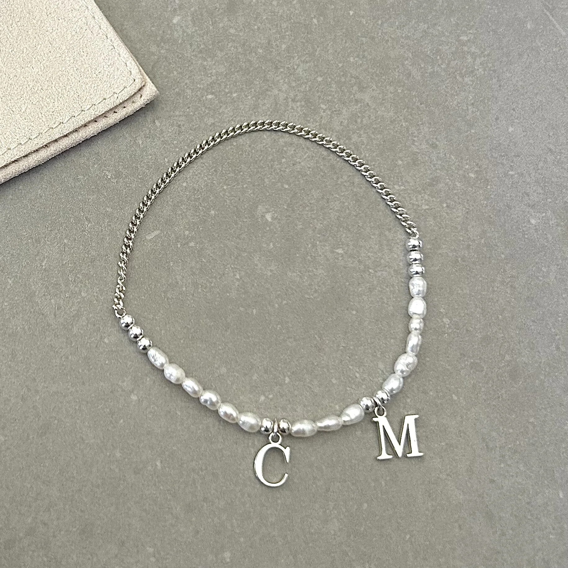 Sterling Silver chain with aaa+ Freshwater Pearls and 2 Sterling Silver initial charms.